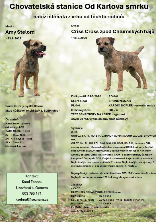 Chovatelská stanice Od Karlova smrku nabízí štěňata Border terierů s průkazem původu. Narozená 22.3.2026. Štěňata budou očkovaná, čipovaná, pravidelně odčervená s pet pasem, kupní slmouvou a chovatelským servisem. Štěňata jsou odchováváná v domácím prostředí, zvyklá na kontakt s lidmi. Oba rodiče s PP, zdravotně testovaní s vyrovnanou povahou a výborným kontaktem s lidmi. Využívaní v myslivecké praxi.