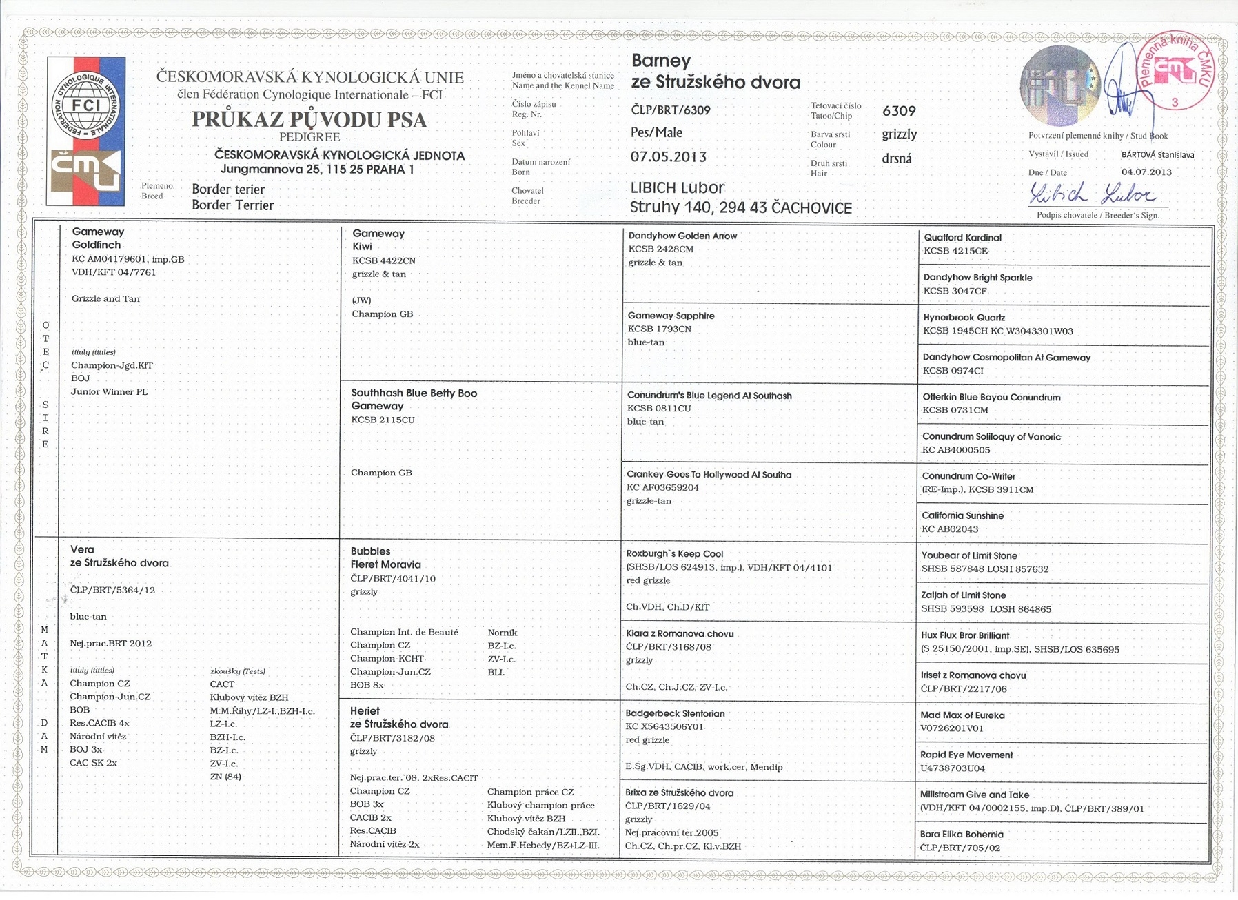 2xCAJC,CCJ,2xBOJ,3x CC, 5xCAC,2x CAC C-MKU, r.CACIB, 2xCACIB, JCH CR,CH CR, 2x BOS, BOB, Evropský vítěz, Klubový vítěz, CH KCHT
