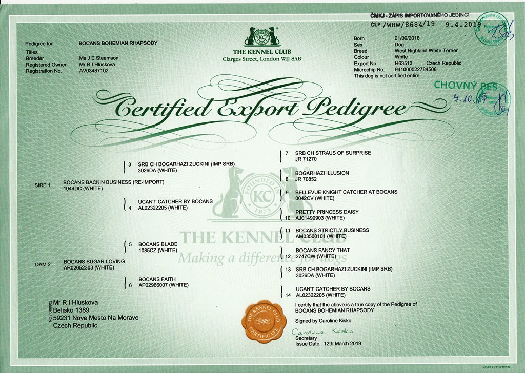| 11.01.2020 | Národní (CAC) Brno/CZ | Vladimíra Tichá/CZ | mezitřída | V1, CAC, Národní vítěz, BOS /9 b. |