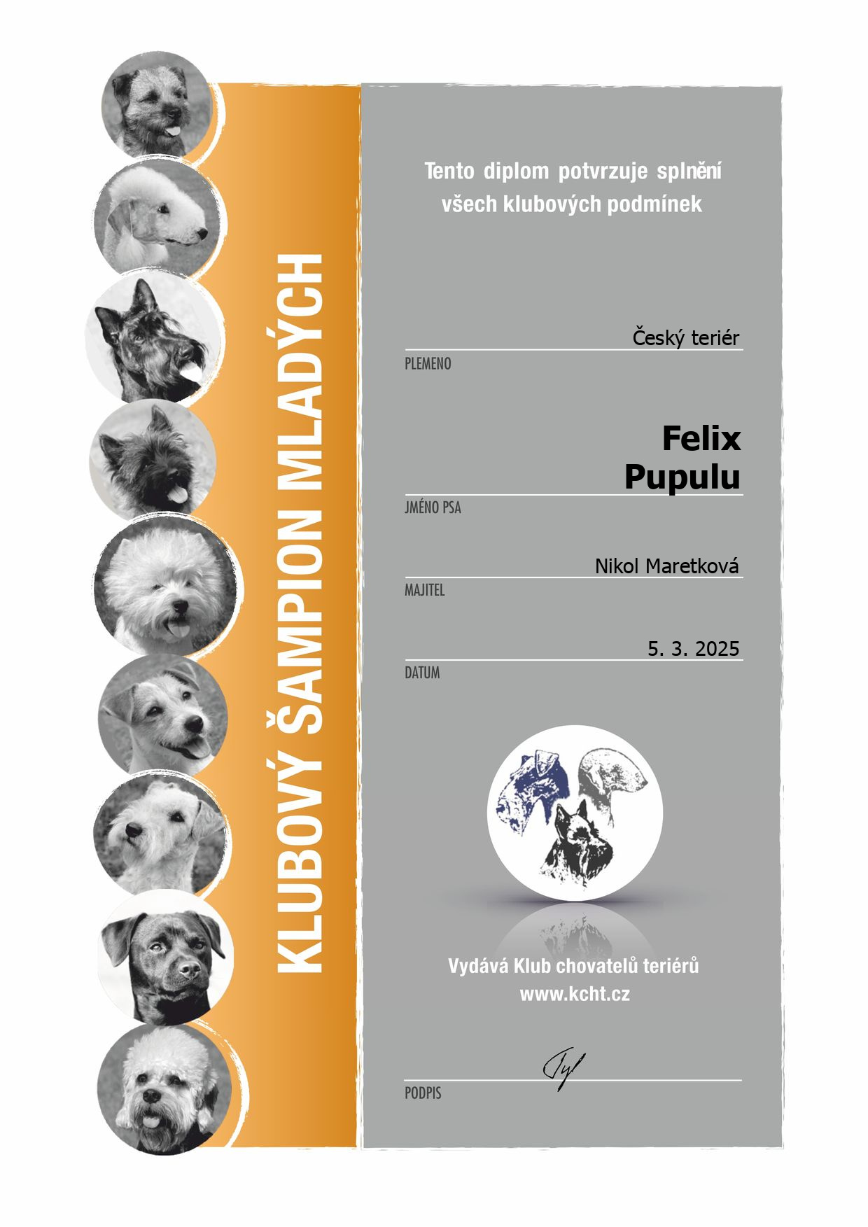 výborný, C.I.B. - J, JCH. ČR, JCH.SK, JCH.PL, JCH KCHT, CH A. CH PLR