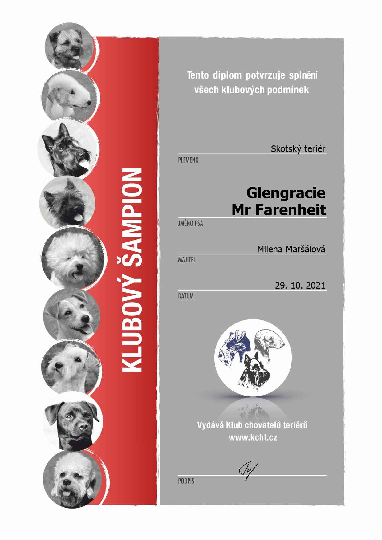 | 31.12.2021 | Nejlepší teriér KCHT/CZ | Krása | Vítěz plemene, 83 b. / 11 v. /83 b. | |